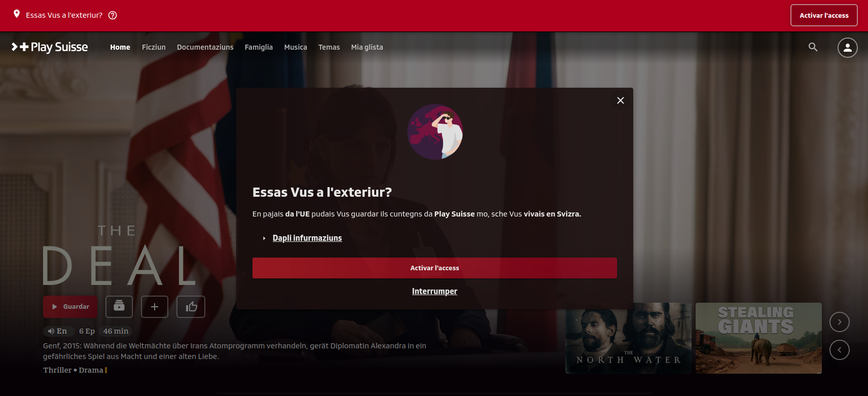 Mais uniquement en Suisse : en théorie, les contenus de Play Suisse sont bloqués à l’étranger. Cependant, les personnes résidant en Suisse et disposant d’un numéro de téléphone suisse peuvent activer l’accès dans les pays de l’UE. Si l’on tente d’accéder à Play Suisse depuis l’Allemagne, par exemple, la question « Êtes-vous à l’étranger ? » apparaît.